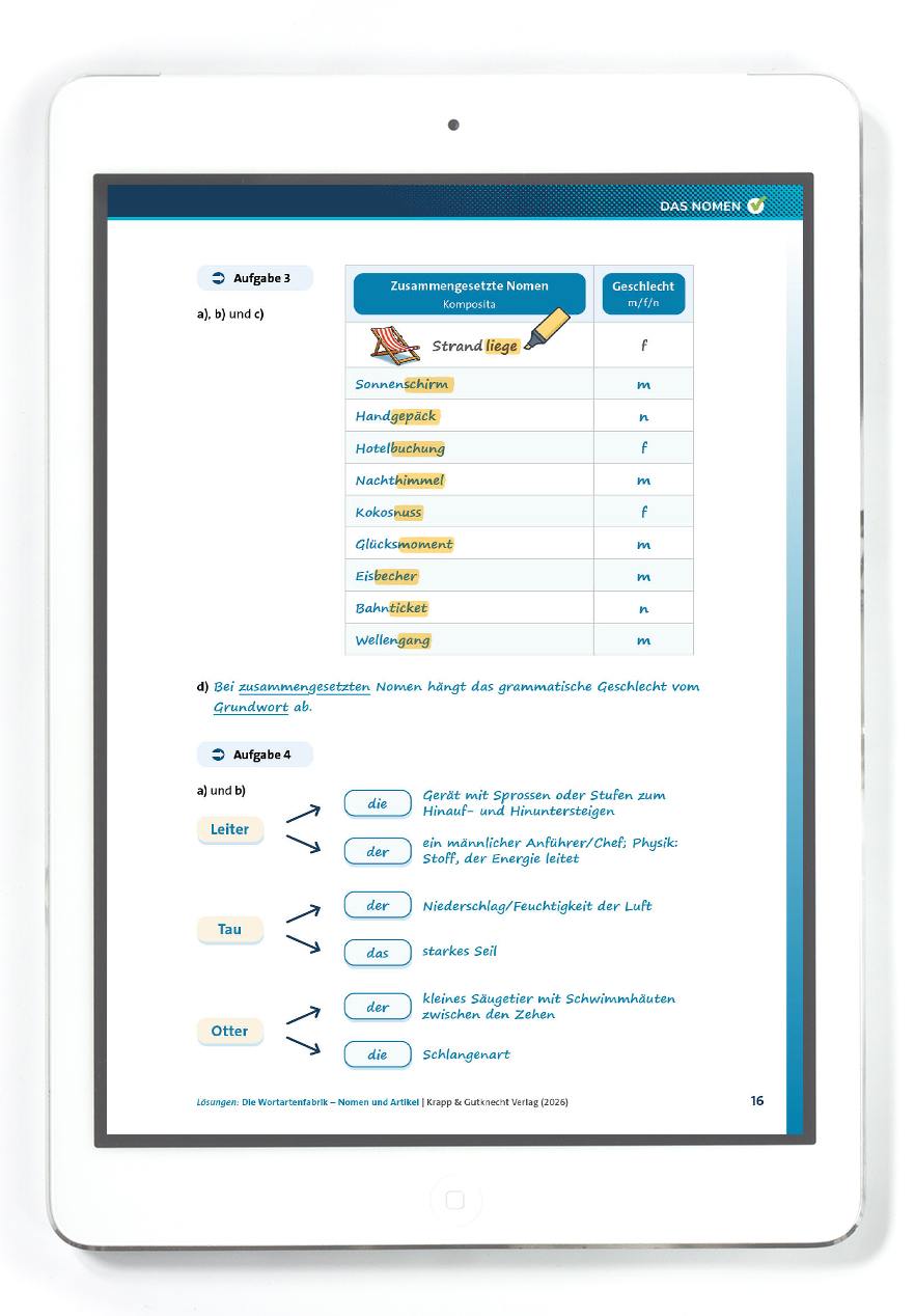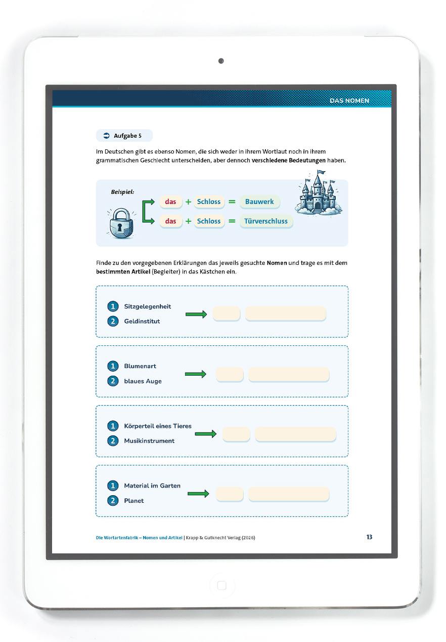 Die Lernenden setzen sich intensiv mit den drei grammatischen Geschlechtern auseinander und lernen, Nomen sicher zu bestimmen und korrekt mit Artikeln zu verwenden: