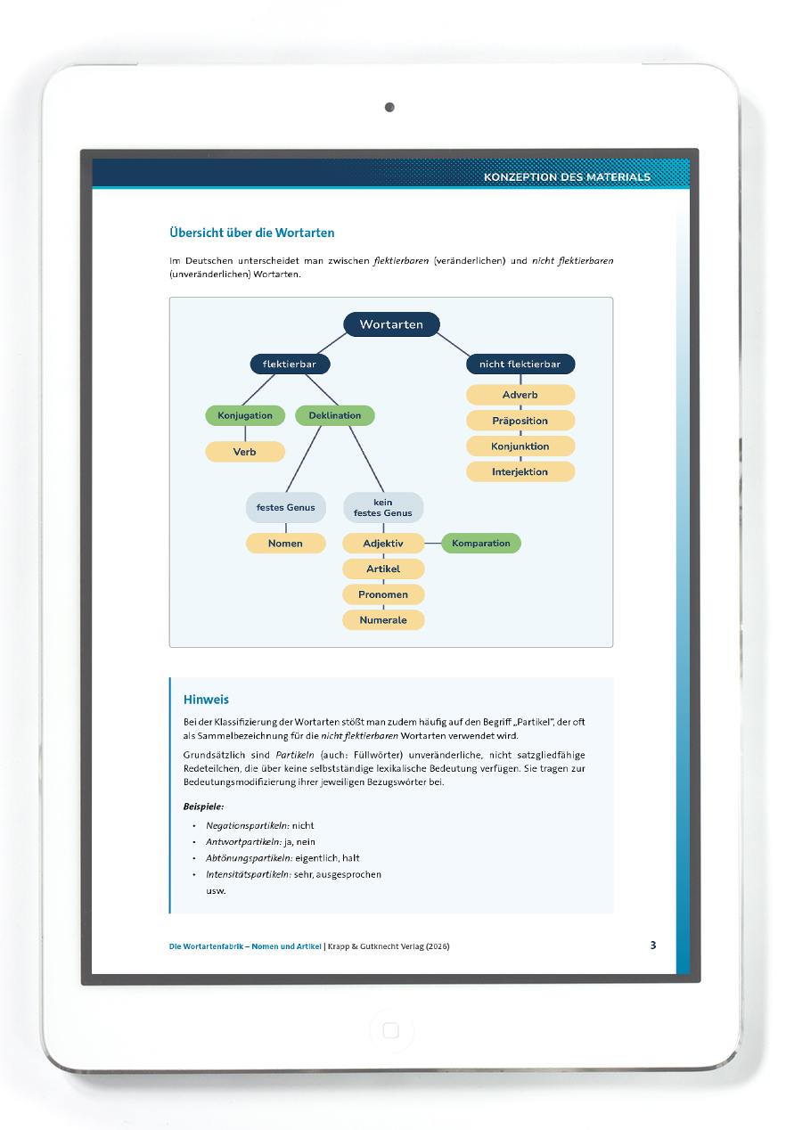 Das PDF ist Teil des Lehrerheftes Die Wortartenfabrik und richtet sich an Lehrkräfte der Klassen 5 bis 8. Es eignet sich sowohl zur Einführung als auch zur Wiederholung und Festigung grundlegender grammatischer Inhalte. Die Einbettung in die motivierende Lernumgebung der „Wortartenfabrik“ unterstützt die Lernenden dabei, sich aktiv und nachhaltig mit der Wortart Nomen auseinanderzusetzen.