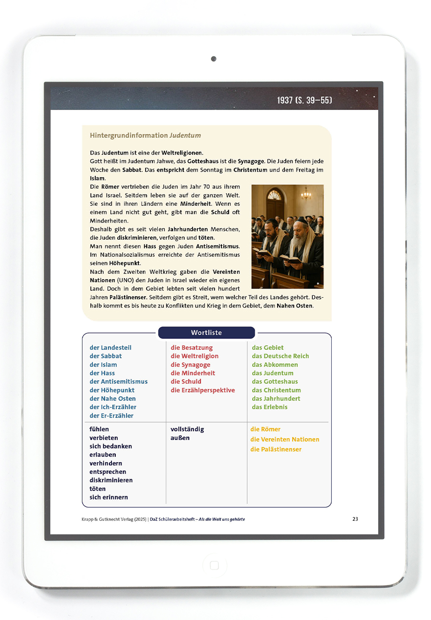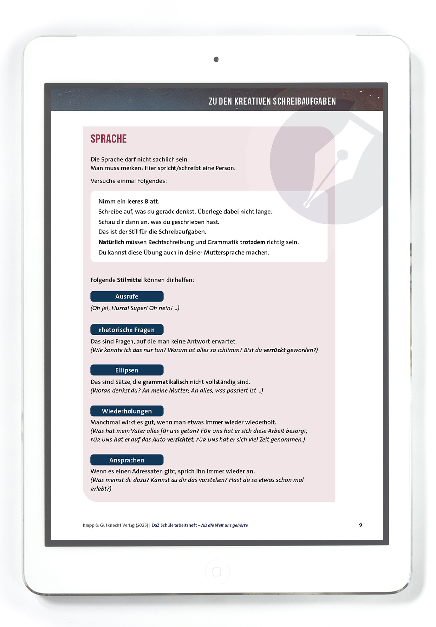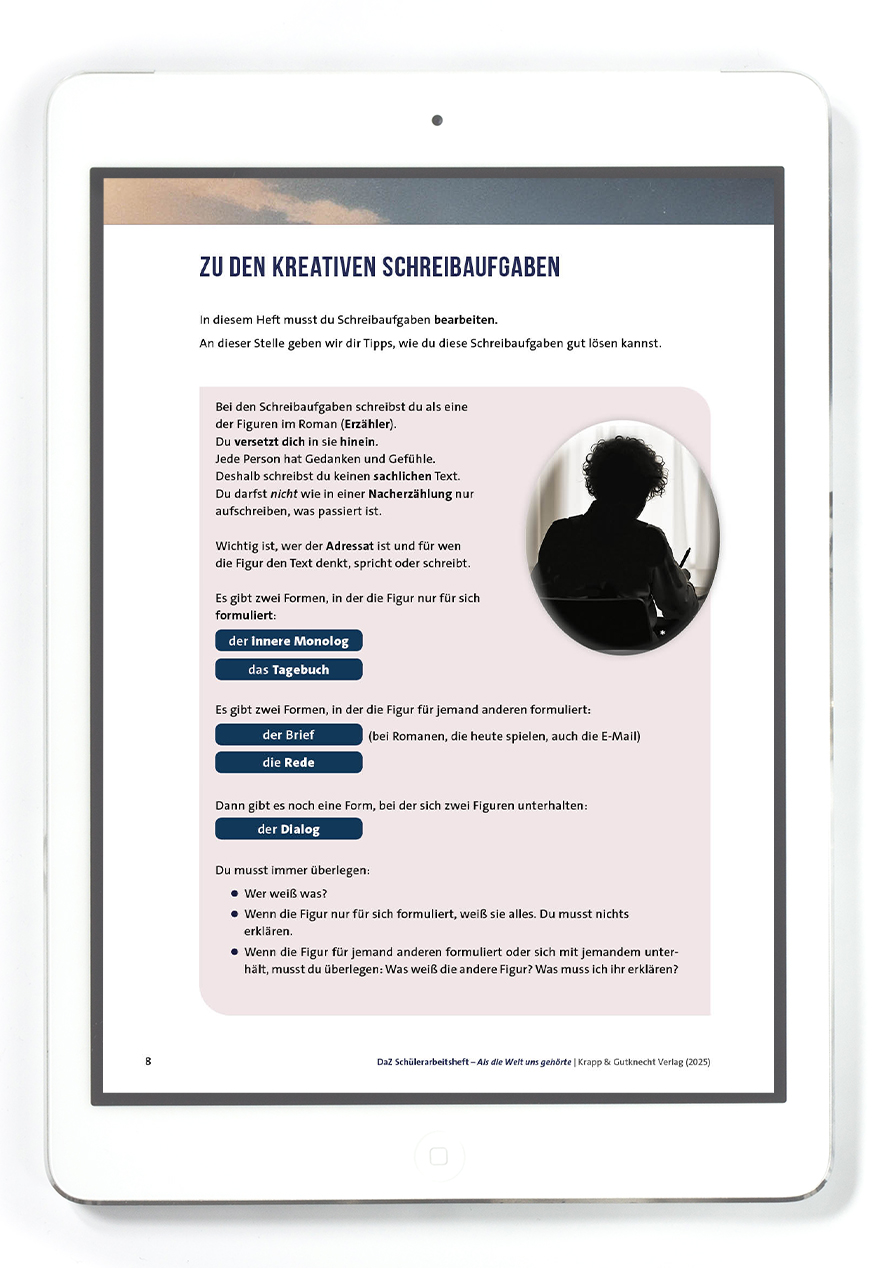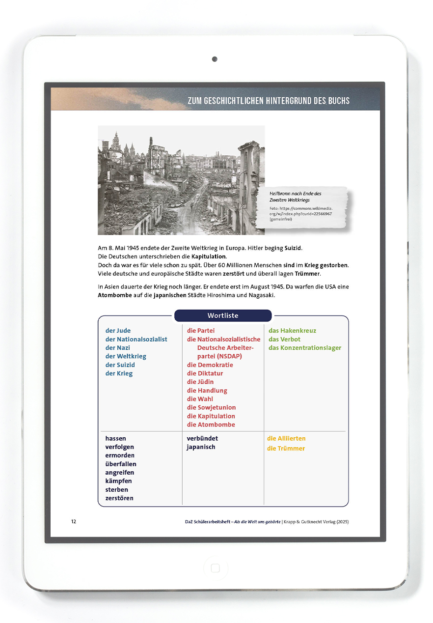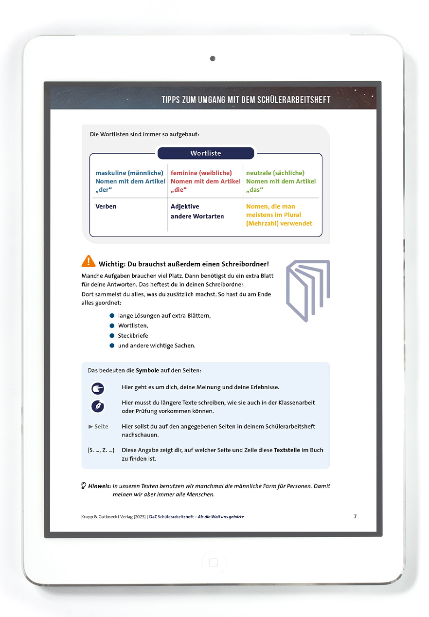 Schülerinnen und Schüler im Nach-VKL-Status erfolgreich zum Abschluss zu führen, ist eine anspruchsvolle Aufgabe. Genau hier setzt unser ergänzendes Schülerarbeitsheft für Deutsch als Zweitsprache (DaZ) an: Es wurde speziell für Lernende dieser Zielgruppe entwickelt und ist parallel zum regulären Schülerarbeitsheft Als die Welt uns gehörte einsetzbar – ohne zusätzlichen Planungsaufwand für Lehrkräfte.