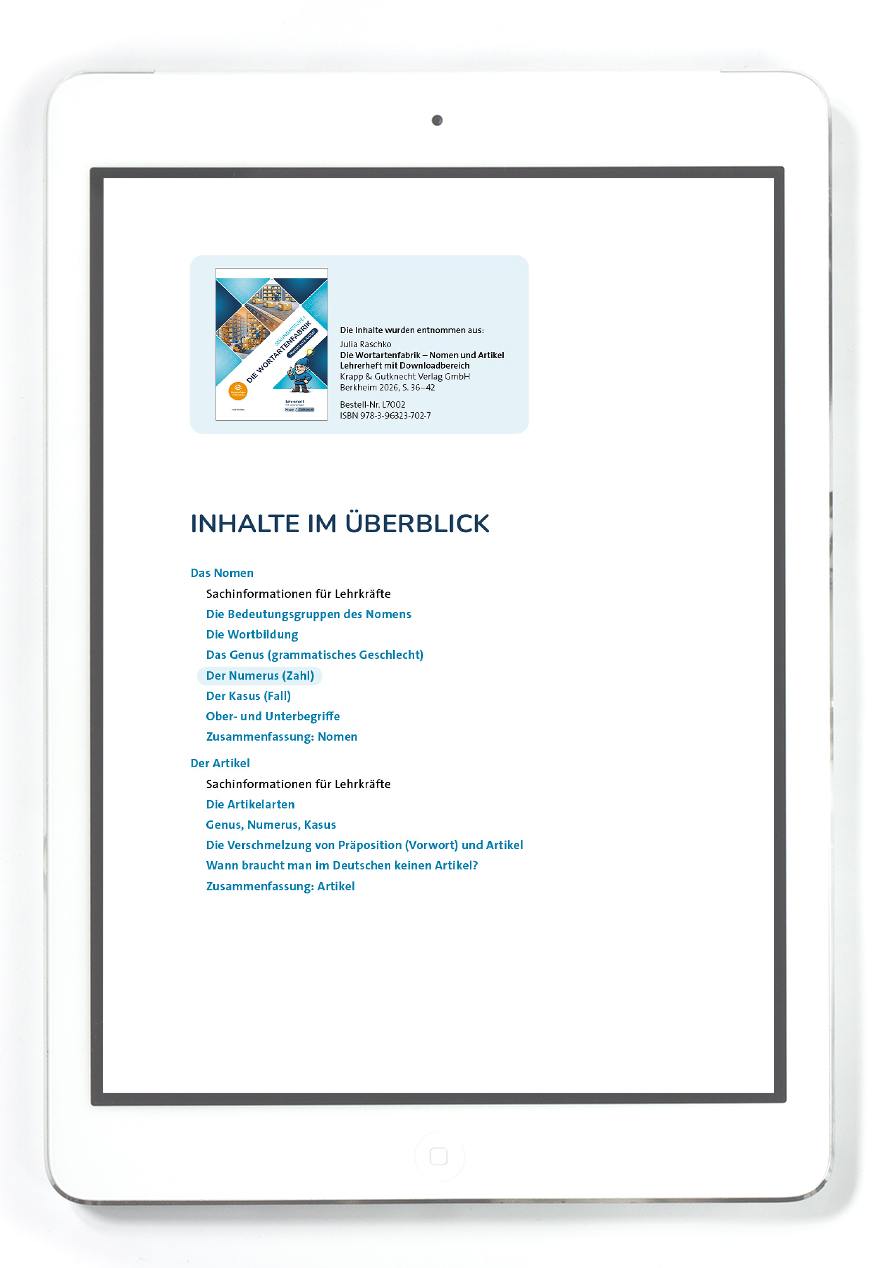 Das PDF ist Teil des Lehrerheftes Die Wortartenfabrik und richtet sich an Lehrkräfte der Klassen 5 bis 8. Es eignet sich sowohl zur Einführung als auch zur Wiederholung und Festigung grundlegender grammatischer Inhalte. Die Einbettung in die motivierende Lernumgebung der „Wortartenfabrik“ unterstützt die Lernenden dabei, sich aktiv und nachhaltig mit der Wortart Nomen auseinanderzusetzen.