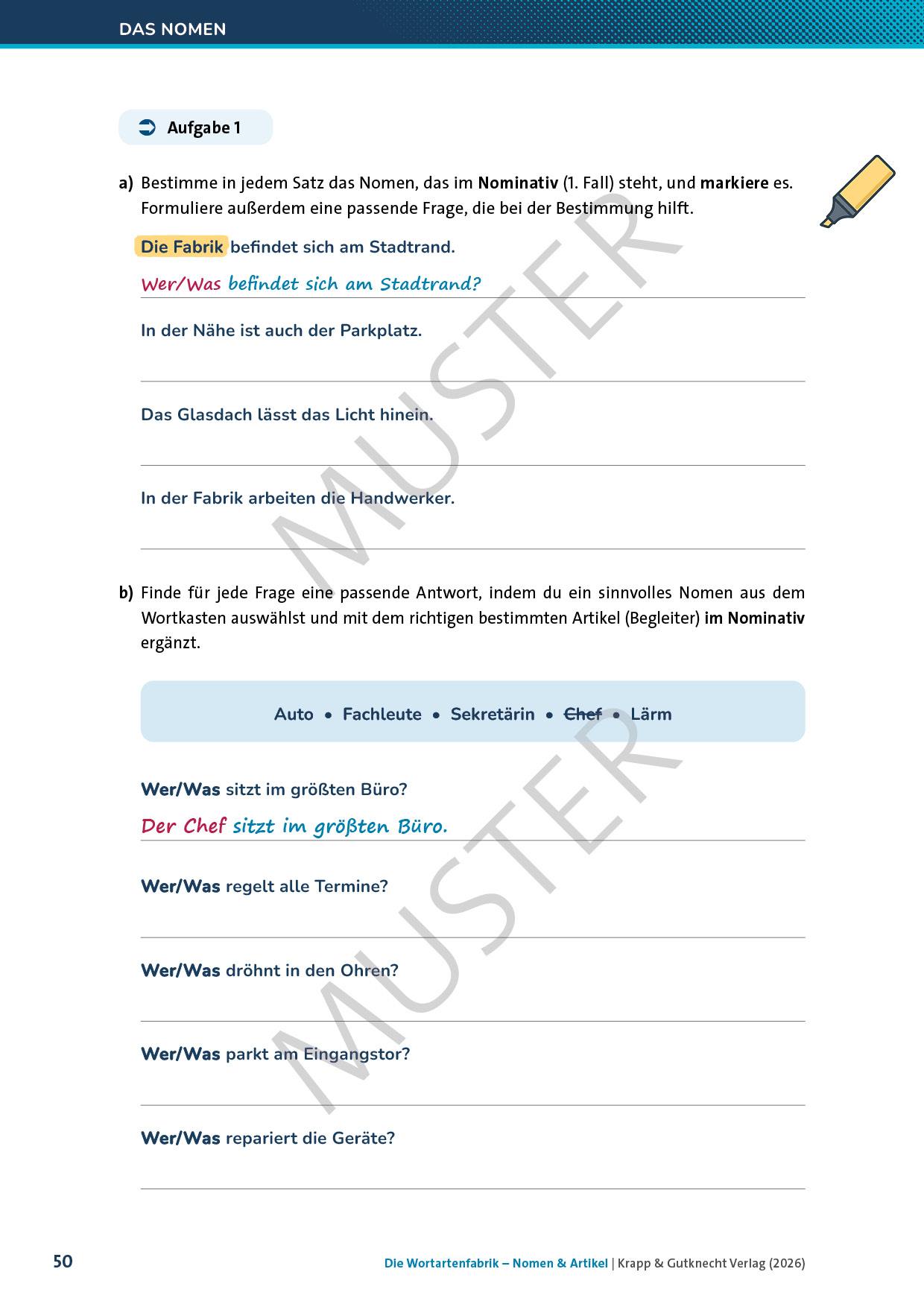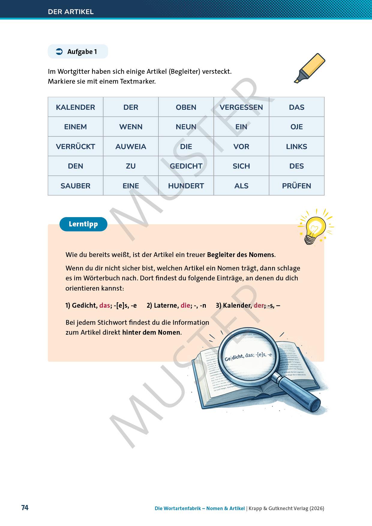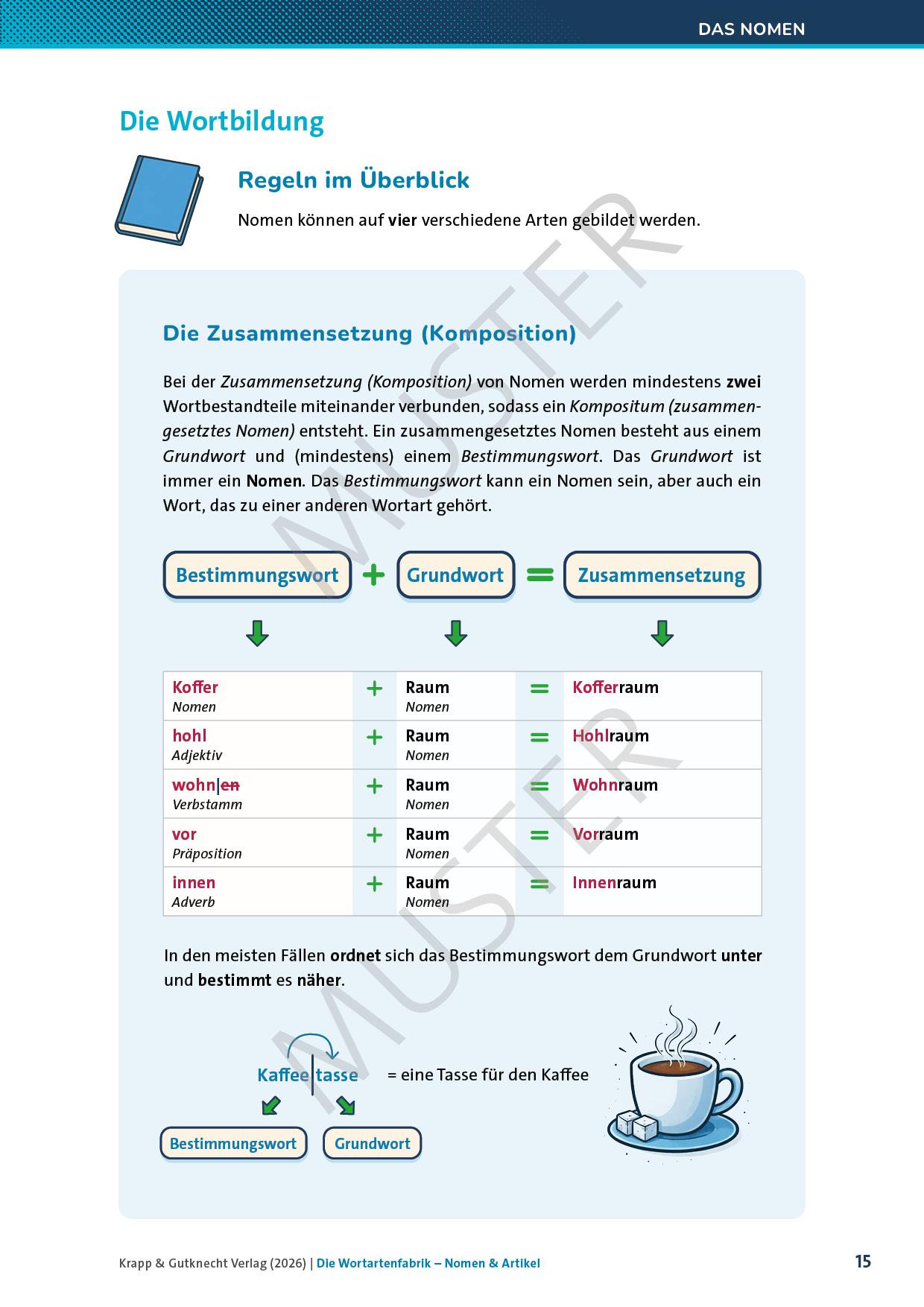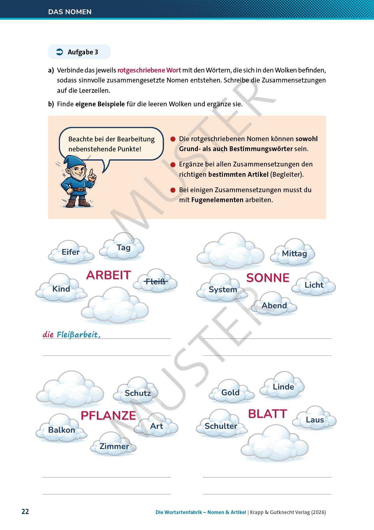 - detaillierte Erklärungen zu den Nomen und Artikeln: Bedeutung, Formenbildung, besondere Eigenschaften