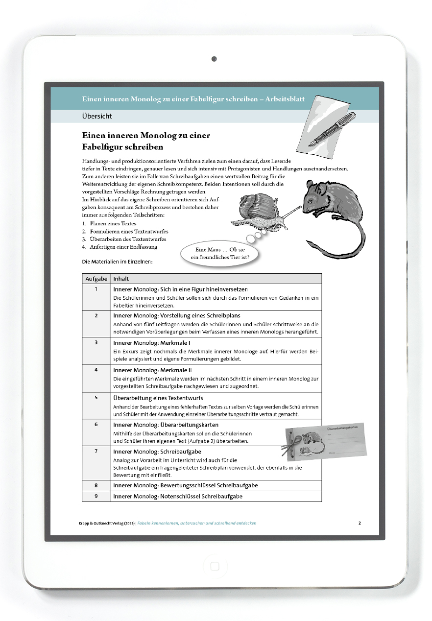 Mit diesen Arbeitsblättern lernen Schülerinnen und Schüler, sich in Fabelfiguren hineinzuversetzen und deren Gedankenwelt in einem inneren Monolog darzustellen. Schritt für Schritt werden sie an das Schreiben eigener Texte herangeführt – von der Planung über das Formulieren bis zur Überarbeitung. Durch gezielte Übungen werden Sprachgefühl, Ausdrucksstärke und Schreibkompetenz nachhaltig gefördert.