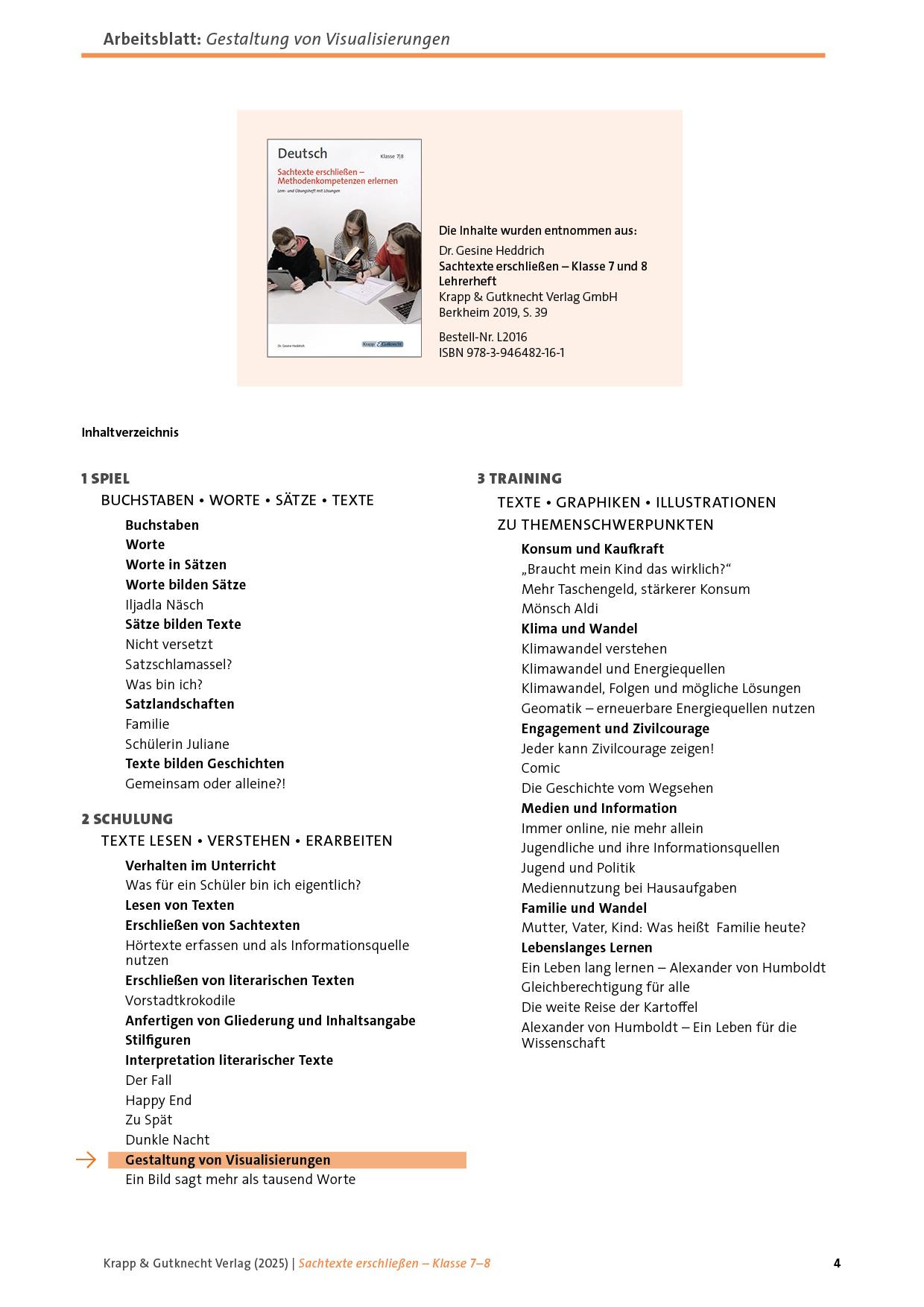Der enthaltene Sachtext Ein Bild sagt mehr als tausend Worte erklärt anschaulich, warum Visualisierungen Gedächtnis und Verständnis unterstützen und welche Elemente für gelungene Darstellungen entscheidend sind: Blickführung, Schriftgrößen, Farben, Formen, Symbole, Medienauswahl und Layoutregeln. Die Lernenden erfahren, wie visuelle Hilfen und akustische Informationen zusammenwirken und wie eine klare Struktur das Verständnis verbessert.