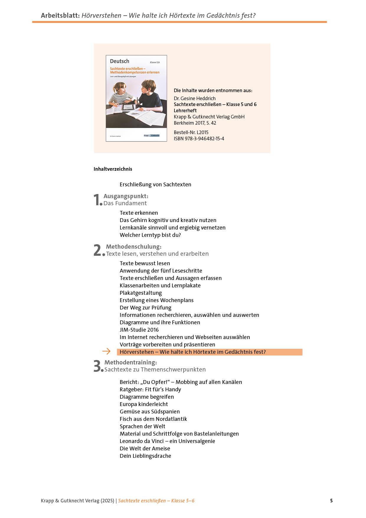 Hörverstehen – Wie halte ich Hörtexte im Gedächtnis fest? – Klasse 5 und 6 – PDF