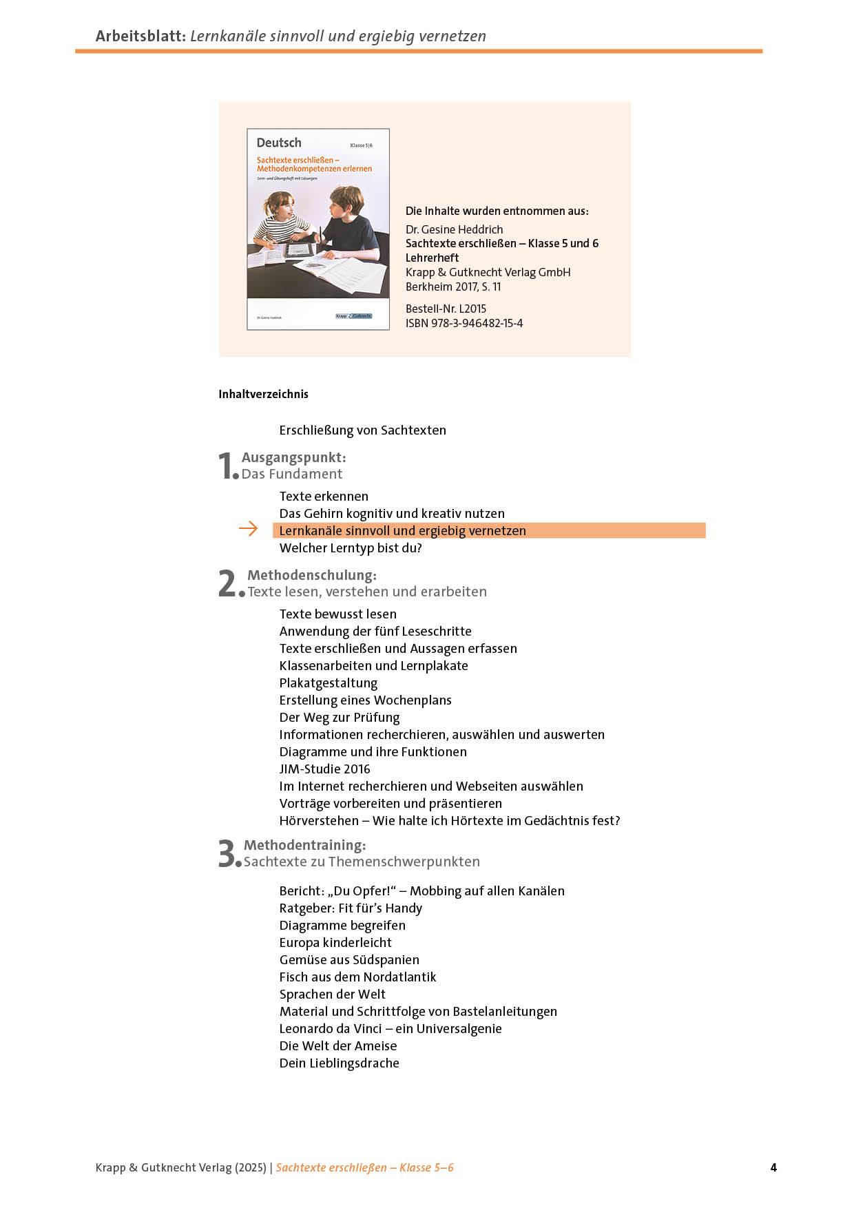 Anhand eines motivierenden Textes und übersichtlicher Abbildungen entdecken sie, welche Lernkanäle es gibt, wie sie zusammenwirken und welcher Lerntyp sie selbst sind. Eine praktische Zuordnungsaufgabe und Reflexionsfragen regen dazu an, das eigene Lernverhalten zu überdenken – ideal für Unterrichtseinheiten zum Thema Lernen lernen oder als Einstieg in Methodentraining.