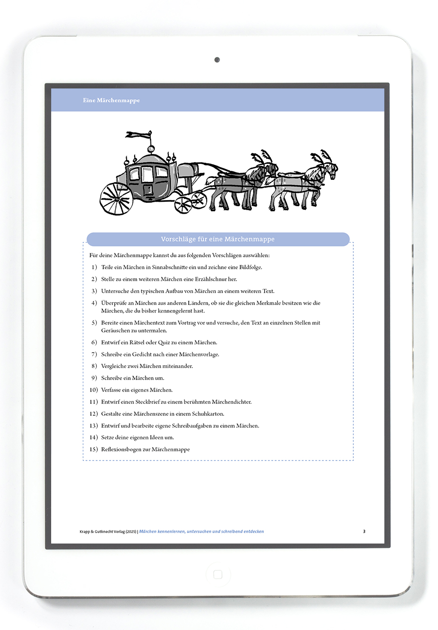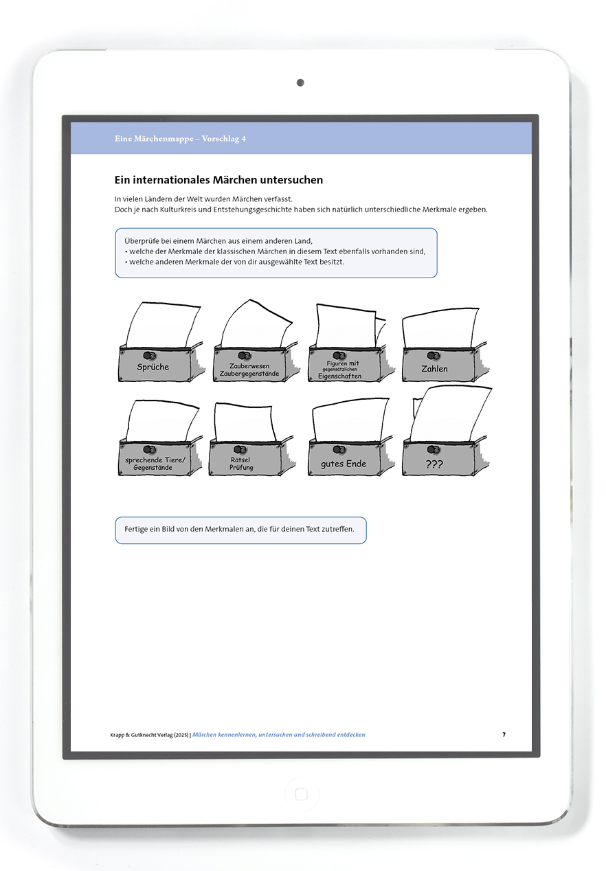 Diese vielseitige Märchenmappe bietet abwechslungsreiche Arbeitsblätter und kreative Schreibaufgaben, mit denen Schülerinnen und Schüler die Welt der Märchen spielerisch erkunden. Sie lernen, Märchentexte zu analysieren, typische Merkmale zu erkennen und eigene Geschichten zu gestalten. So werden Fantasie, Sprachbewusstsein und Ausdruckskraft gleichermaßen gefördert.