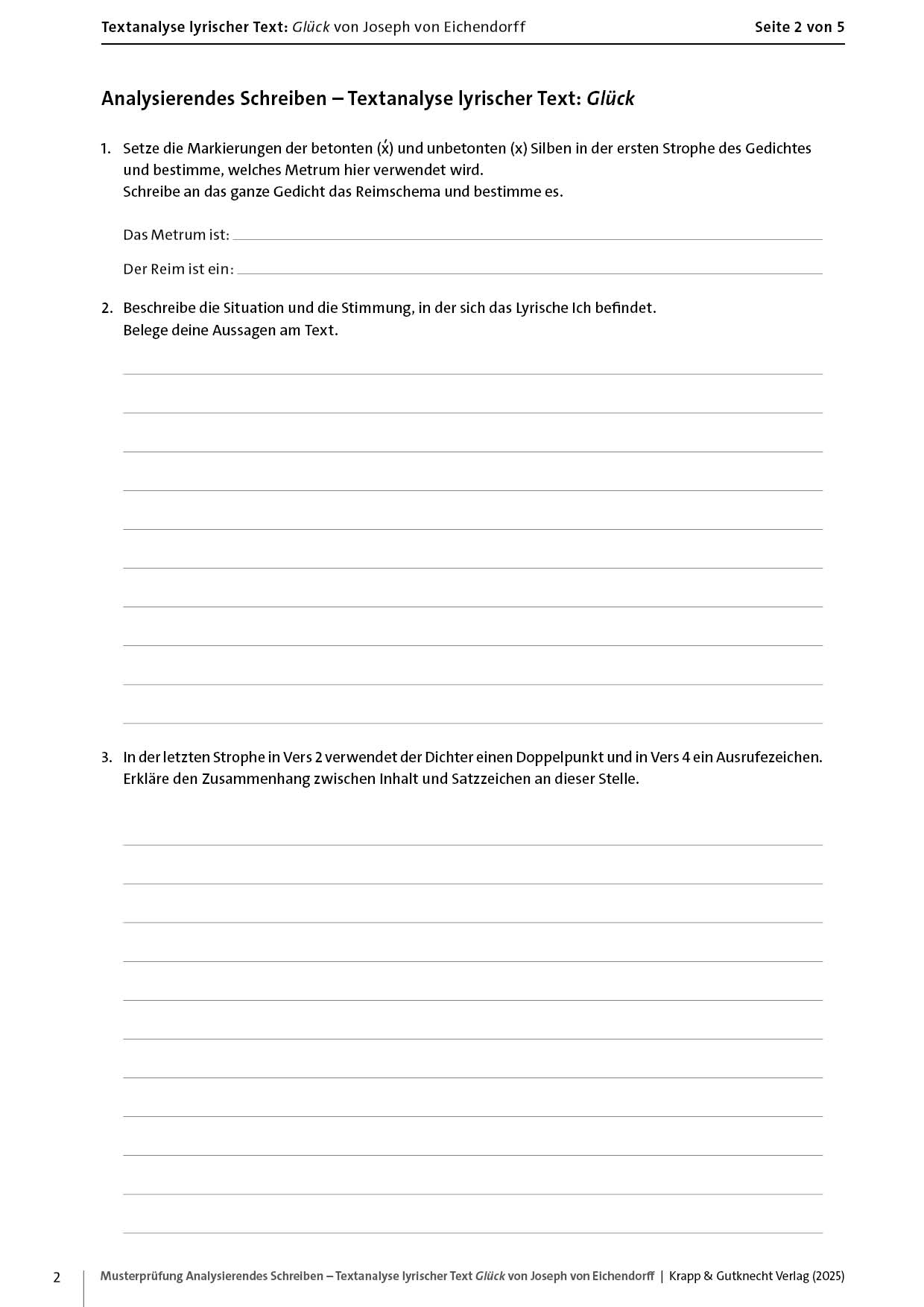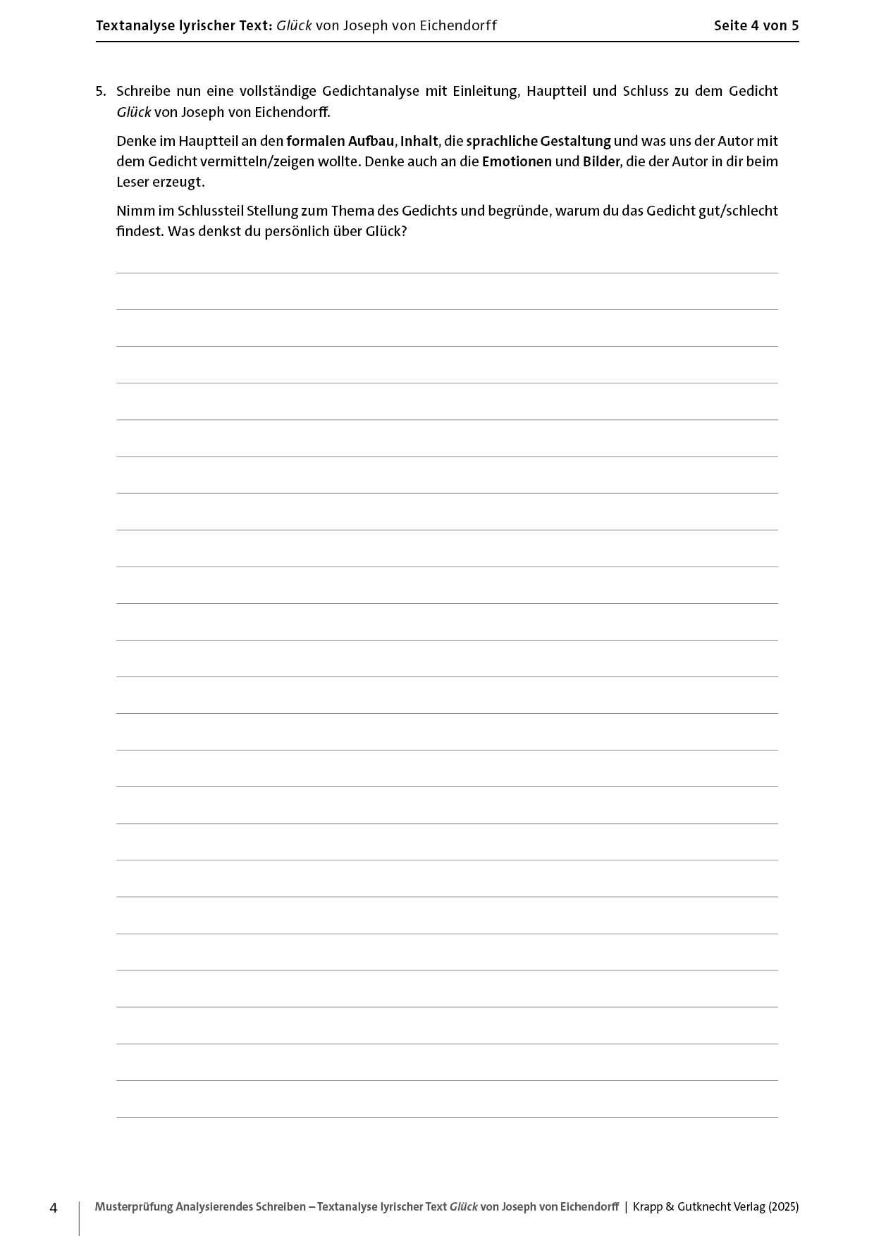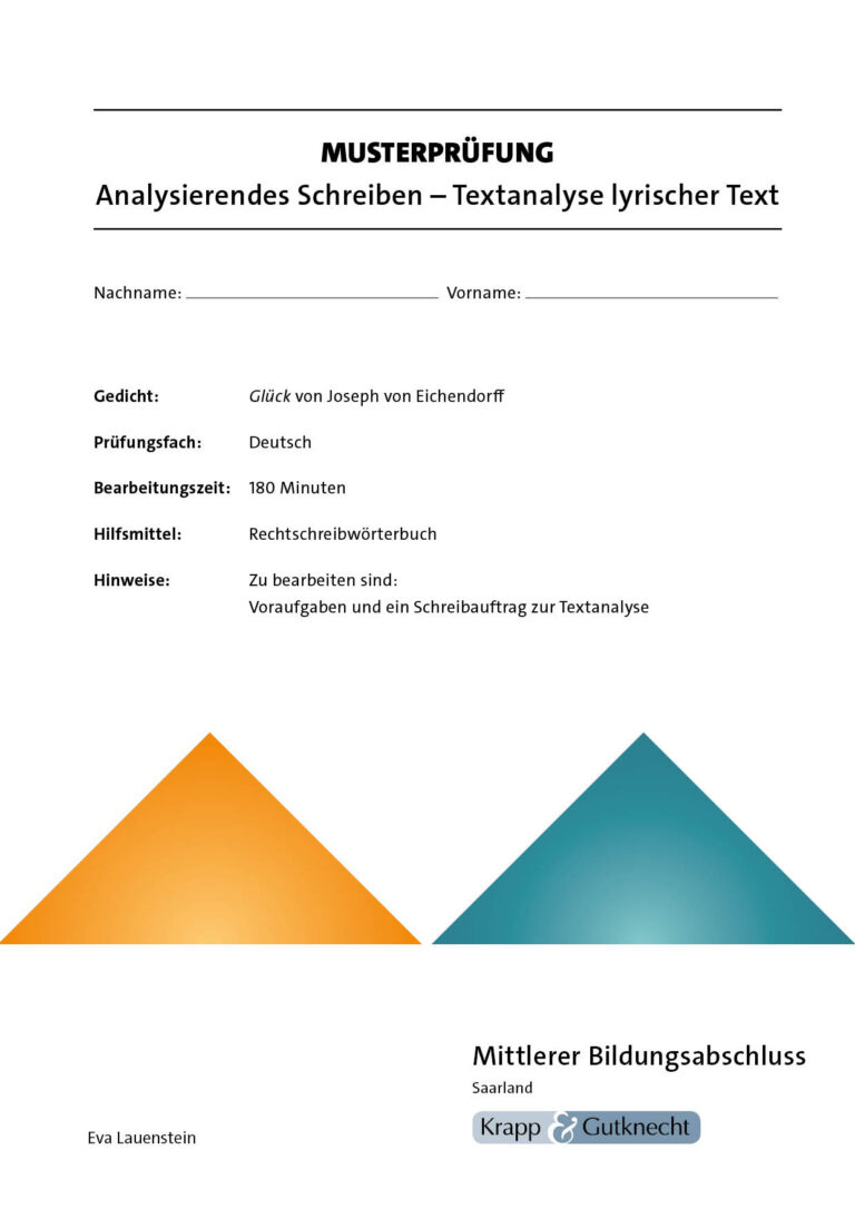 Diese Musterprüfung als Ausdruck bietet Schülerinnen und Schülern der Klassenstufe 10 im Saarland eine realistische Vorbereitung auf die Abschlussprüfung im Fach Deutsch. Anhand des Gedichts Glück von Joseph von Eichendorff üben sie das analysierende Schreiben mit Fokus auf Inhalt, Metrum, Kadenz, Reimschema, Stilmittel und Interpretation.