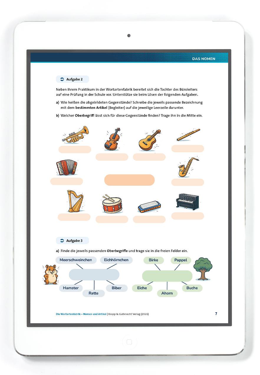 - motivierendes Rahmenthema „Wortartenfabrik“, das die Lernenden durch die Aufgaben begleitet