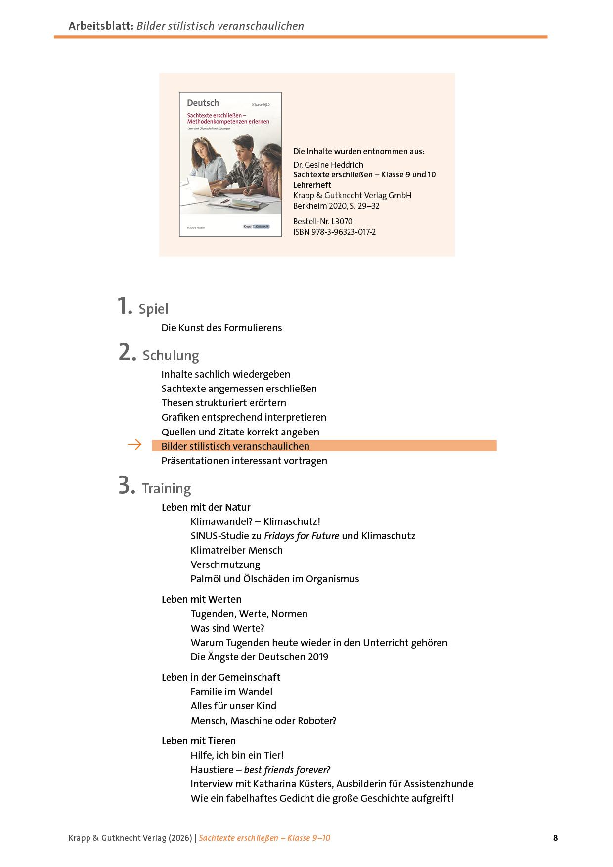 Im Mittelpunkt steht das Erkennen, Benennen und Deuten zahlreicher Stilmittel, die in literarischen Texten, Sachtexten und journalistischen Beiträgen eingesetzt werden. Anhand klarer Definitionen und anschaulicher Beispiele lernen die Schülerinnen und Schüler, sprachliche Bilder zu entschlüsseln und Texte hinsichtlich ihrer Ausdruckskraft zu analysieren. Ergänzend werden kreative Schreibimpulse angeboten, mit denen die Stilmittel aktiv angewendet werden können.