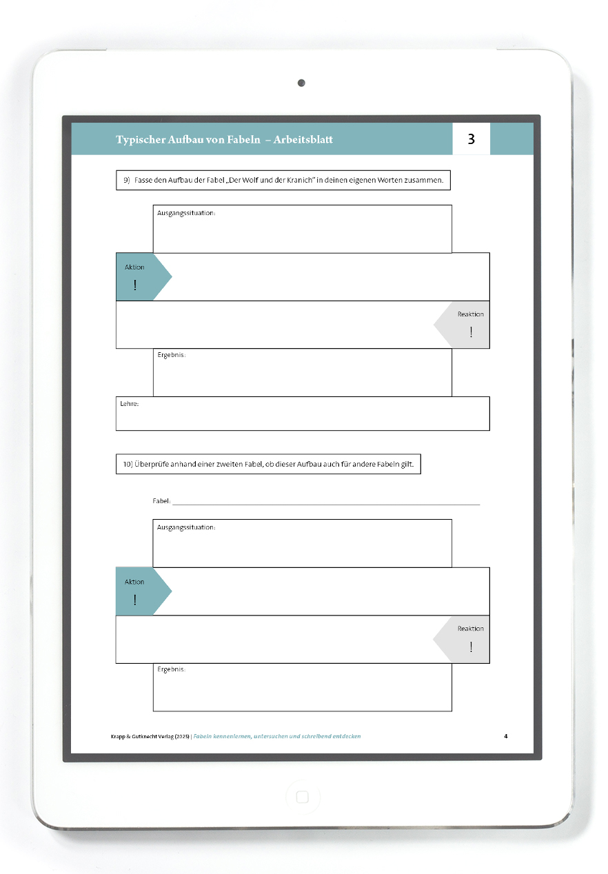 • Einführung in den Aufbau von Fabeln (Ausgangssituation, Aktion, Reaktion, Lösung, Lehre)